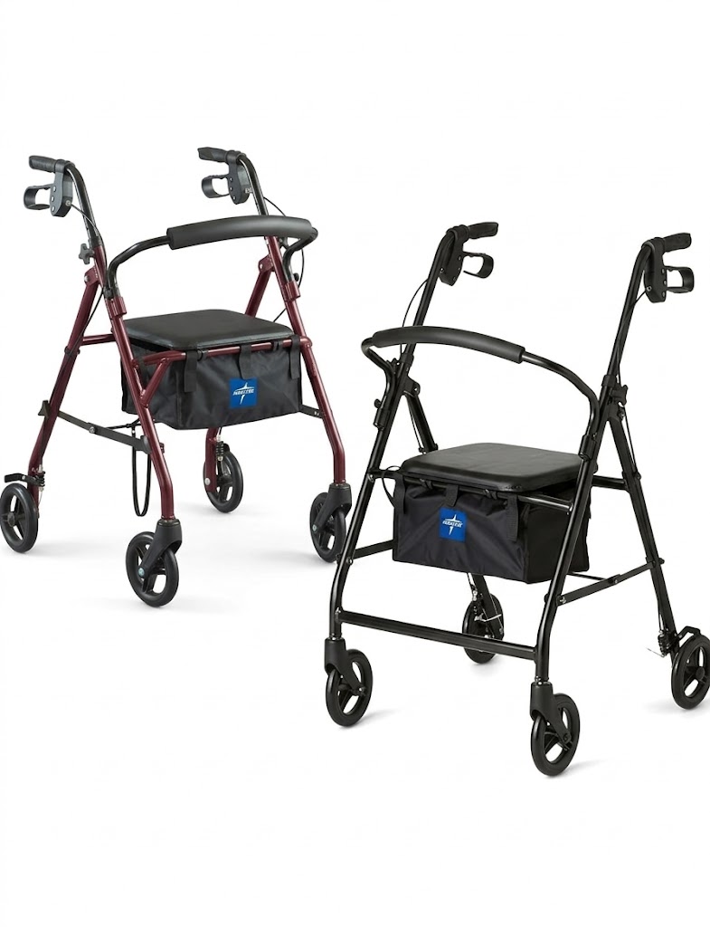 BASIC STEEL ROLLATORS WITH SEAT AND BRAKES/HEIGHT 24.5″ MIN-29.5″ MAX/WEIGHT CAPACITY 350 LBS/WHEEL SIZE 6″.